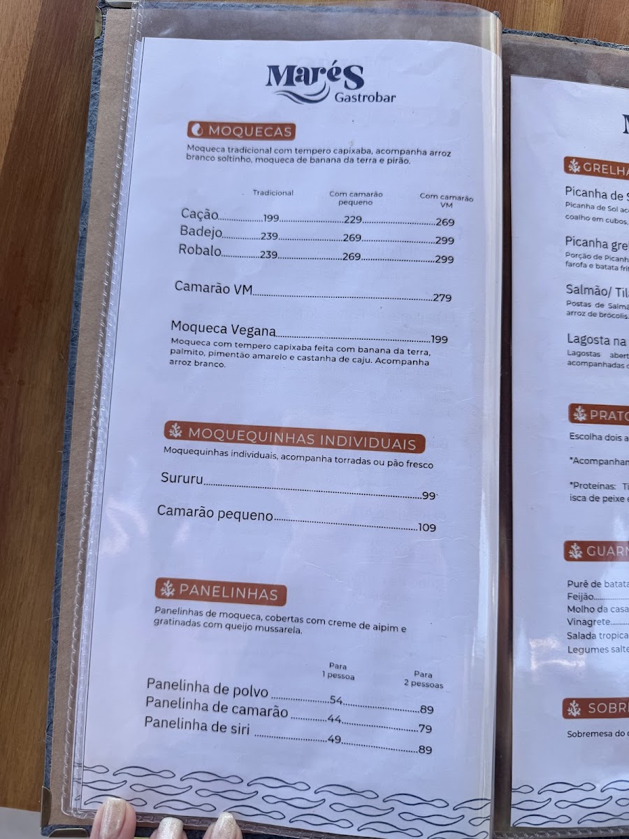 Highlights include traditional moquecas with shrimp or dogfish, savory options like carne de sol served with aipim, and shareable plates such as the tábua de peroá. The menu extends to rich, creamy rice dishes and inventive snacks like shrimp coxinha and escondidinho de camarão, all pairing naturally with a cold chopp or a glass of Malbec.